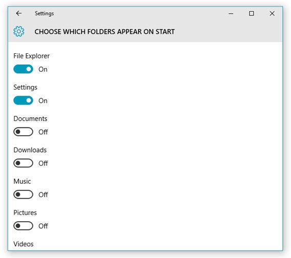 While the Windows 10 Start Menu has relatively few options, it does at least let you choose what appears in it. Find this in Options – Personalize – Home.