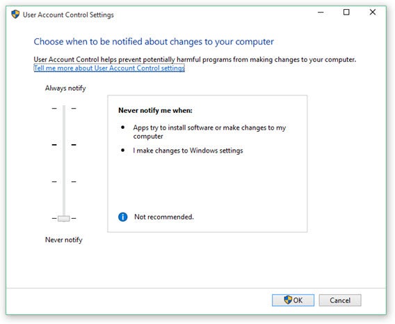 You can change how much UAC will ask for verification, luckily. Open the Control Panel, then User Accounts, and User Accounts Control Settings. Here you’ll find four levels of UAC: