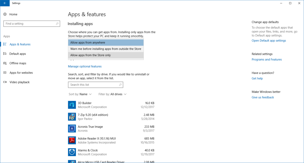 Criminals aren’t the only ones trying to install malware on your computer. Sometimes, users such as young children can inadvertently install applications that cause problems. Another step for locking down Windows 10 is to change permission on which apps can get installed on the computer. With Windows 10 Creators Update, there is an option to only allow software from the Windows Store to be installed.