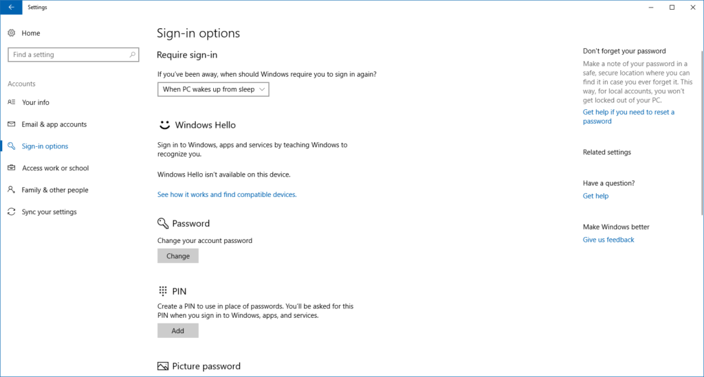 If you prefer to be a bit more old-fashioned or, as is the case with our test computer, your device doesn’t support Windows Hello,then make sure to set up a password or PIN.
