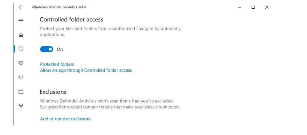 The window will show a switch for Controlled folder access, which you can now turn On.