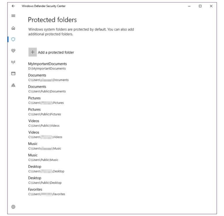 Most commonly used folders are protected, including Documents, Pictures, Music, and Videos. If you want to add other folders, including those on external drives, click on Add a protected folder and name the path to be protected.