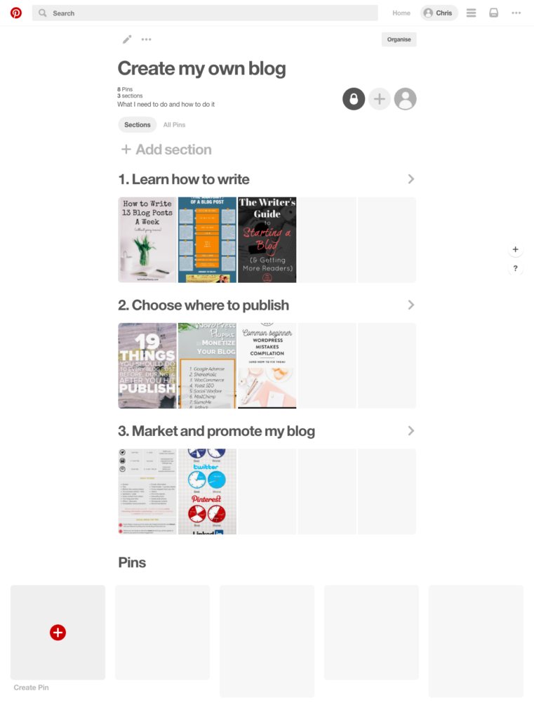 In the example above, the goal is to write my own blog. So, I create a new board called “Create my own blog.” Then, I create different sections with each step I need to take in order to be successful. Within each section are my pins. Each pin is another resource for helping me achieve the goal outlined in the section heading.