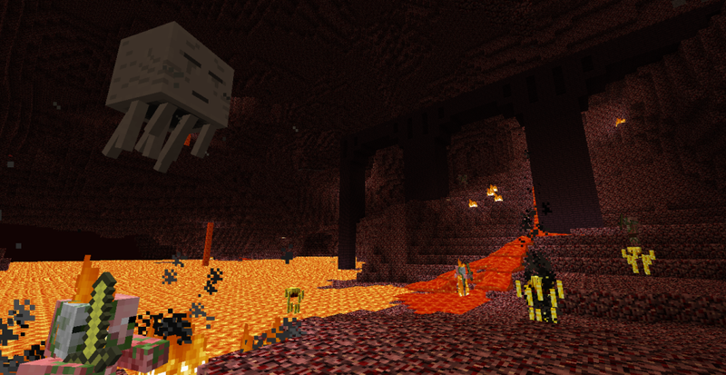 Upon arrival, you will be greeted by an unforgiving world filled with lava pools, fiery dark terrain and lots of scary mobs. You can find many treasures in The Nether, such as Nether Fortresses, but there are plenty of adversaries too. Zombie Pigmen and Ghasts are two of the commonly found monsters here, and they are not pleasant.