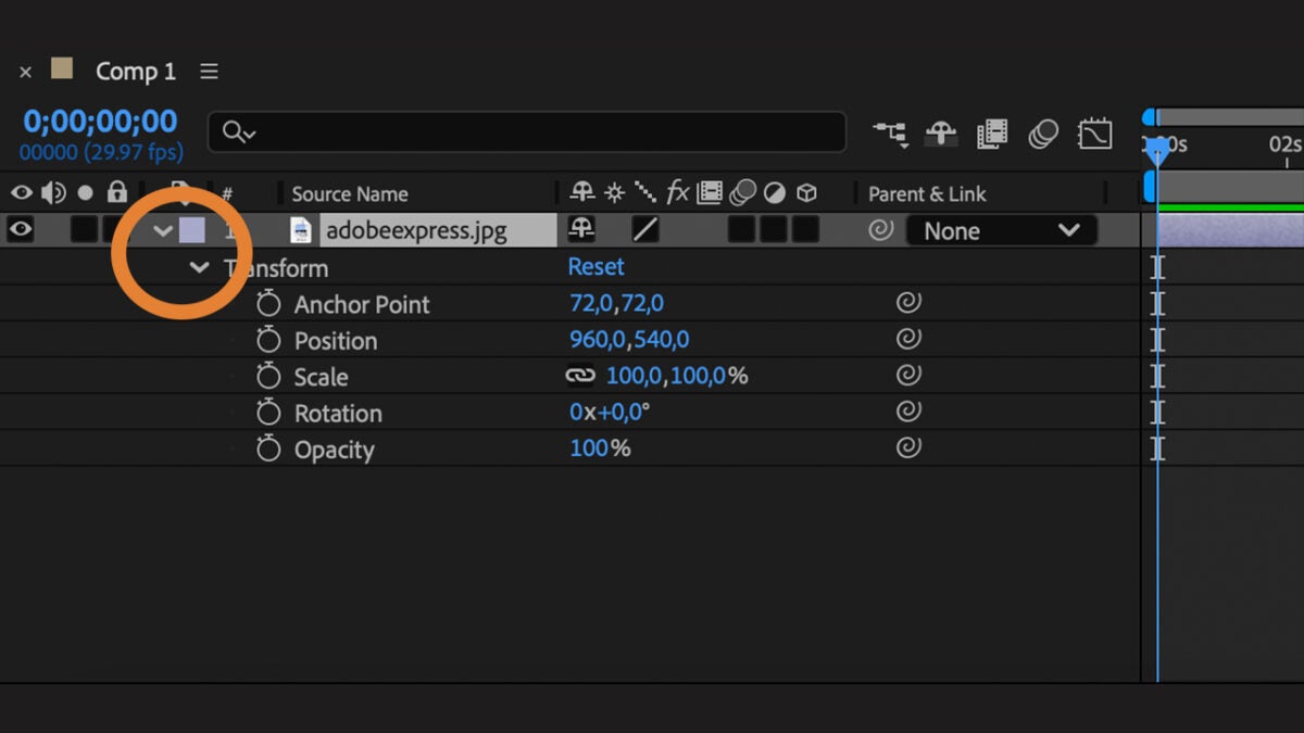 - In the selected layer, click on the arrow symbol on the left and select which section you want to animate. It can be the scale, position, opacity, etc.