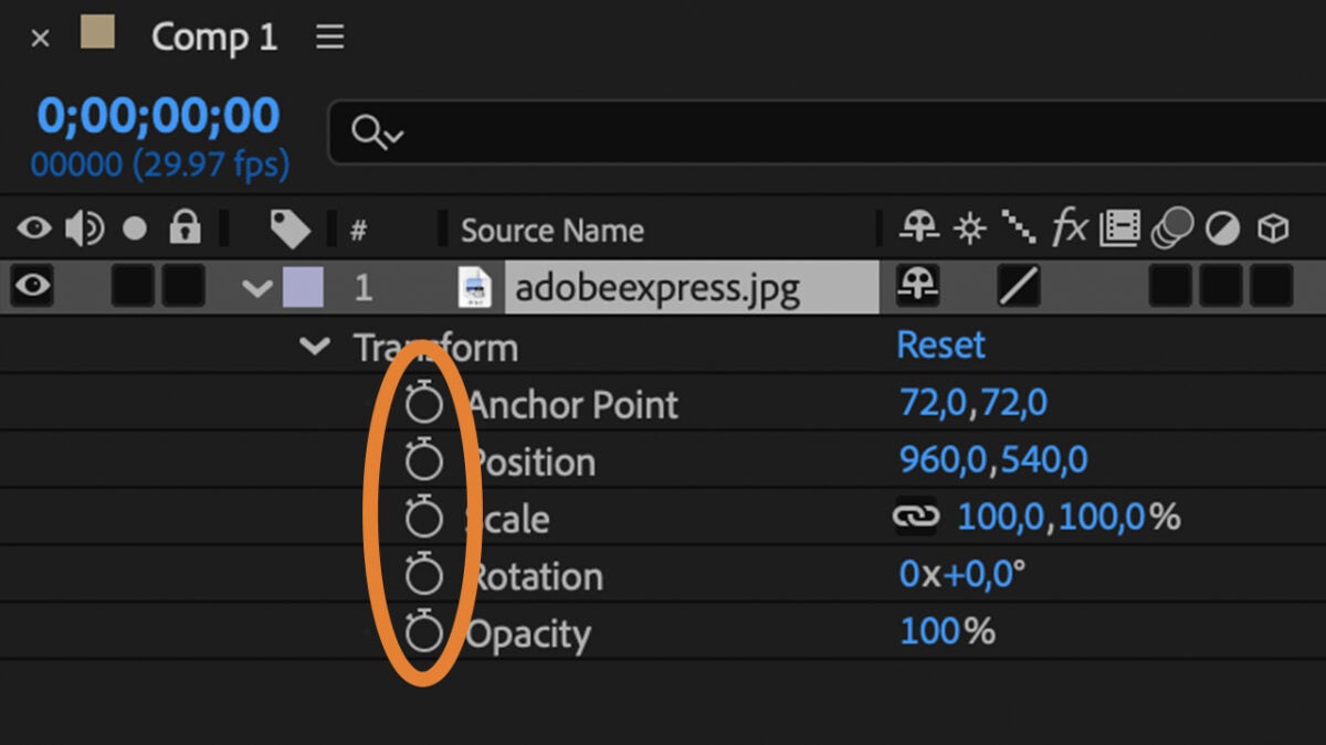 - When you already know what to animate, activate the keyframe by clicking on the clock icon located to the left of the property.