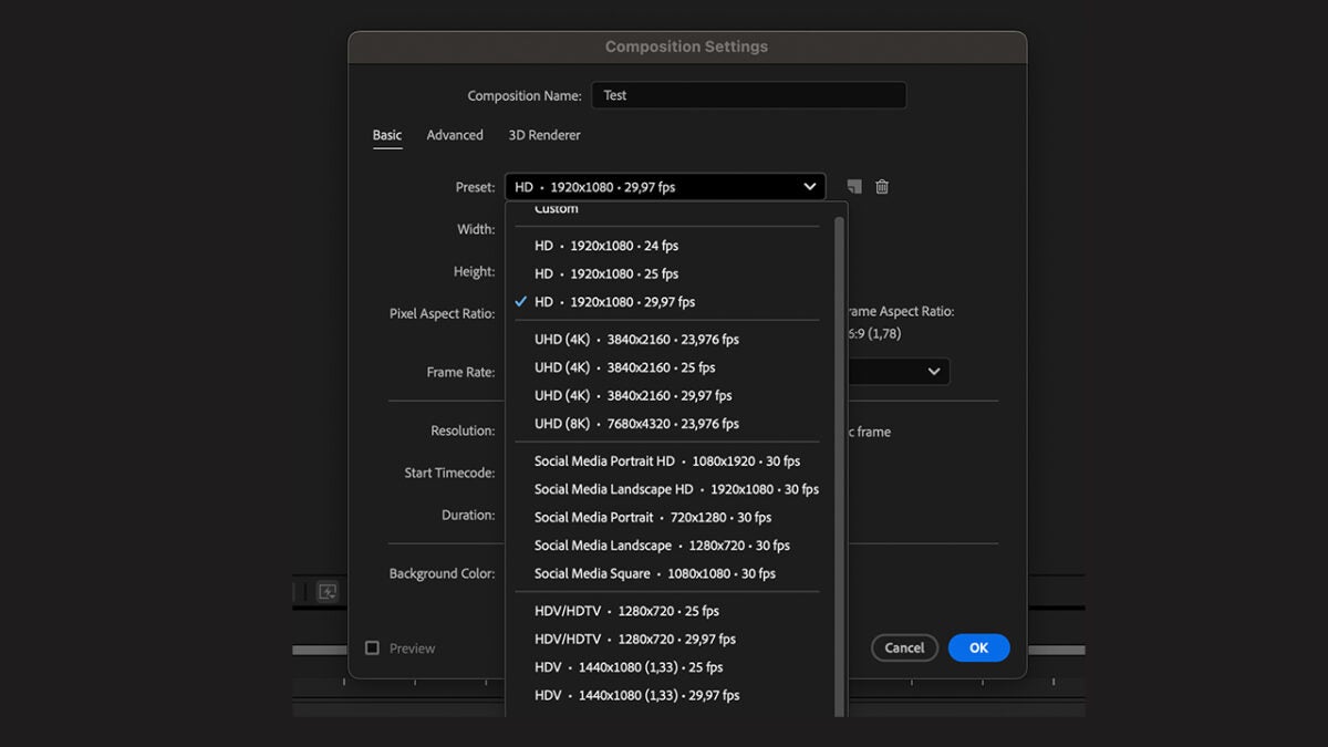 Before starting, we will need to prepare a new project within After Effects. From the home page, click on New Project and then New Composition. A new window, Composition Settings, will open, where we will need to write the project title and set its resolution, among other things. For this occasion, click on Preset and choose the HD option. If you want to try other resolutions, through Preset, you will see a long list of different resolutions and sizes.