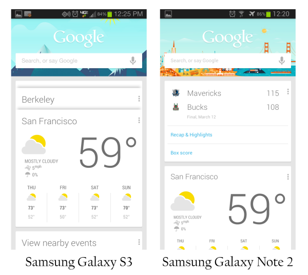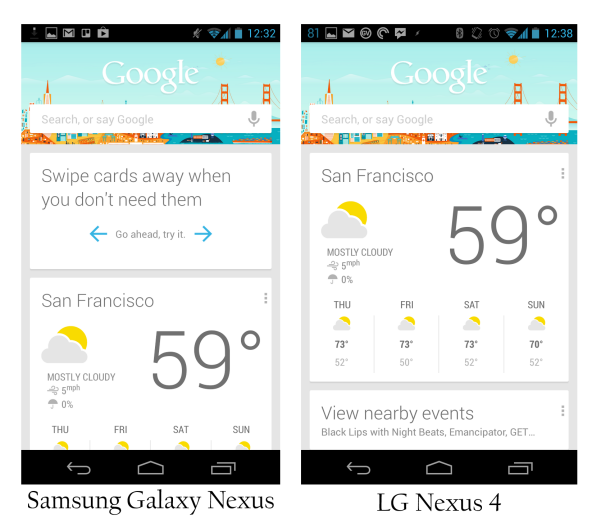 Looking at stock Android devices, you can see that there is little difference between the Android 4.2 Holo Theme and Samsung TouchWiz. This is mainly because Google Now is built into Google Search which is an app rather than a service built into the operating system.