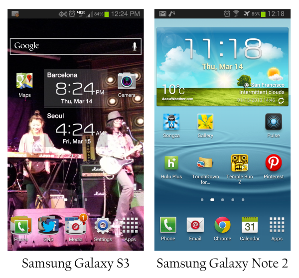 These two examples are of my personal Samsung Galaxy S3 and a stock Samsung Galaxy Note 2. Since I like having only important apps on the homescreen, they are located in the bottom launcher separated by type. The most used common apps are Google Maps and a quick app shortcut to the Camera. Otherwise, the time widget is the only other important information I need.