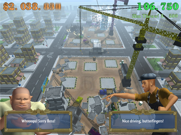 Crane wars is an almost ready for release game from Flashbang studios, the quirky team behind Paper Moon, Off Road Velociraptor and Minotaur China Shop. You can play a beta 3 version of this browser game here. You control a crane at a construction site, and have to build tower blocks, while watching out for attacks from a neighbouring crane company. You can throw objects at the competition’s buildings, and they can do the same! The game is timed – your budget is constantly being drained, and when it runs out the game is over.