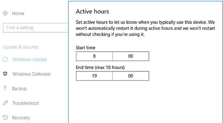 When you open “Windows Update” from the “Settings” app, you can see the “Change active hours” link. Here, you may tell Windows Update the hours that you work.
