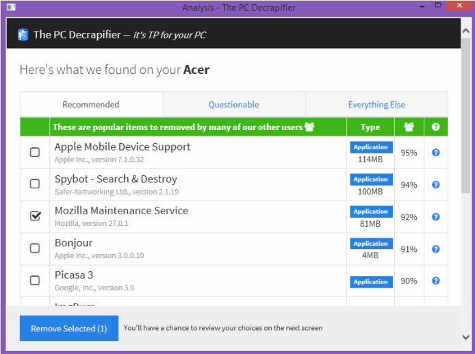 PC Decrapifier, a straightforwardly named tool, can detect bloatware. The software initially takes few minutes to analyze the system. Later, it categorizes into 3 types: Recommended, Questionable, and Everything Else.
