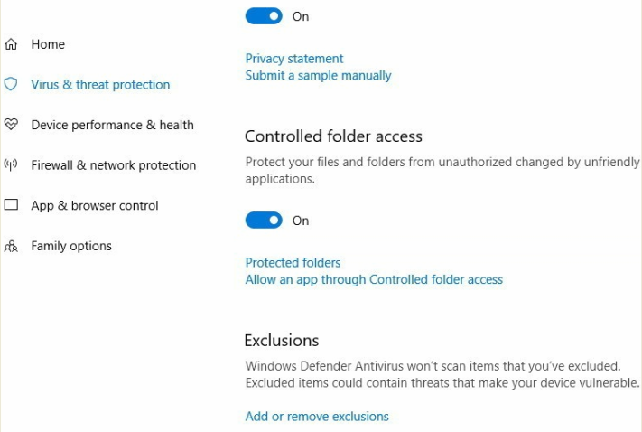 Now you will be able to toggle on and off “Controlled folder access” button. Here, some folders are protected by default. Users can add few more to the list of “Protected folders”.