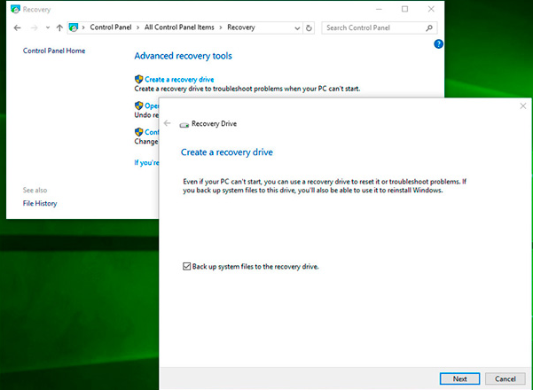 A window appears and the first option is “Create a recovery drive.” Click this option and a wizard appears on the screen. This can guide you through the process of creating a USB recovery drive. The drive can be used to start the PC into the recovery environment.