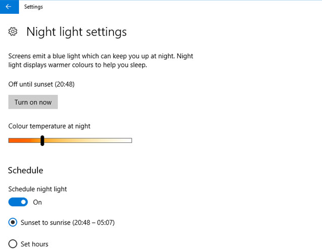 To make effective changes, click on “Night light settings” right under the “Night light” switch. Here you can manually adjust the color temperature and schedule your night light hours. You can make your screen display yellowish colors by dragging the slider “Color temperature at night” to the right or left.