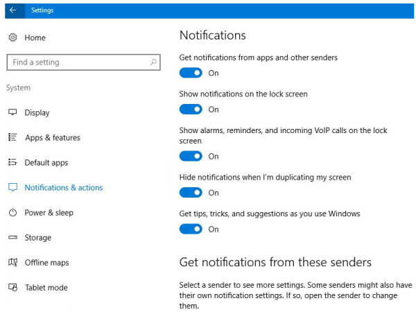 The “Notifications & actions” panel in the “System” settings allows you control and tame all notifications, and notifications from individual apps and programs.