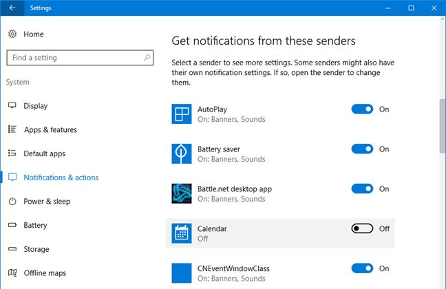 The first option “Get notifications from apps and other senders” allows you to turn all app and program notifications on or off globally. This is the switch use if you don’t want to be bothered by notifications. Scroll down the list and you will see On/Off switches for every app and program installed on the PC that can create alerts. For instance, if Adobe Creative Cloud is annoying you, turn off their notifications completely.