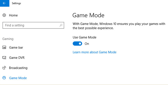A Windows 10 user may see a good 10 percent increase or more in FPS by keeping apps running in the background while gaming. Also, the minimum frame rates are significantly higher. To turn it on, go to Settings panel -> Gaming -> Game Mode, then toggle the slider to On.