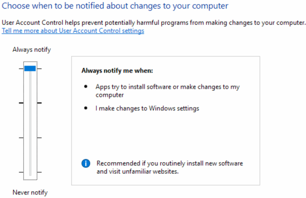 Note: Many users have the tendency to turn off User Account Control. Instead of disabling the UAC, you may decrease the intensity level using a slider.