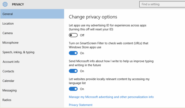 The advertising ID doesn’t just gather your information when you browse, but also when you use Windows 10 apps. In order to protect your privacy and to turn that advertising ID off, launch the Settings app by clicking on the Start button, and go to Privacy -> General. There you can see a list of choices under “Change privacy options.” The first choice controls the advertising ID. Just move the slider from On to Off. You may also restrict access to your microphone and camera in Privacy section.