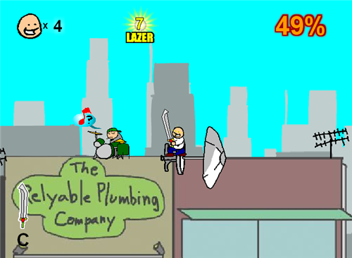 Featuring great cartoon graphics, animation and brilliant story cut scenes, DadGame seems fantastic even before you are let loose at the controls. Thankfully, the gameplay is also really good. It’s chaotic for sure, but as your main task is just to break stuff, using your fists, swords, throwing objects, it’s enjoyable chaos. Creating carnage increases your carnage meter, and when you reach 100%, Dad goes on fire! When on fire, Dad is invincible, and has a range of cool attacks including, of course, lasers coming out of his eye!