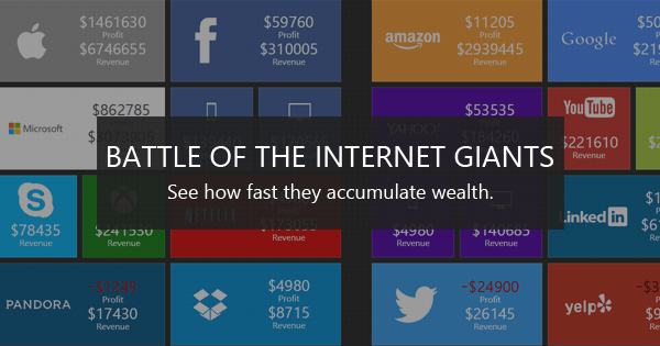 “Battle of the Internet Giants”, as the website is called, consists of a real-time infographic that shows the net earnings of the biggest names in the sector. As you will see, Apple makes an impressive 50% of the total earnings on the page. (Click on the image to view the actual graphic)