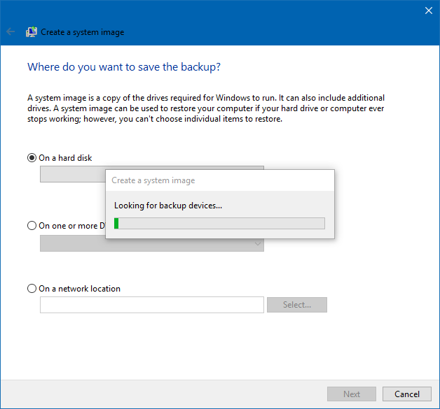 Step 7: Your PC will scan for drives or disks to save the image to.