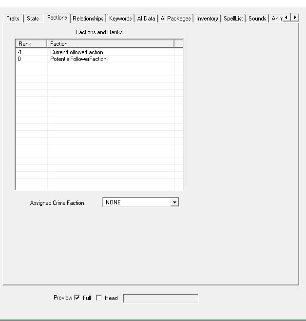 Frankly, if you set this value as anything other than -1 it’s unlikely that your follower will work at all. Do it right and your factions screen should end up looking like this: