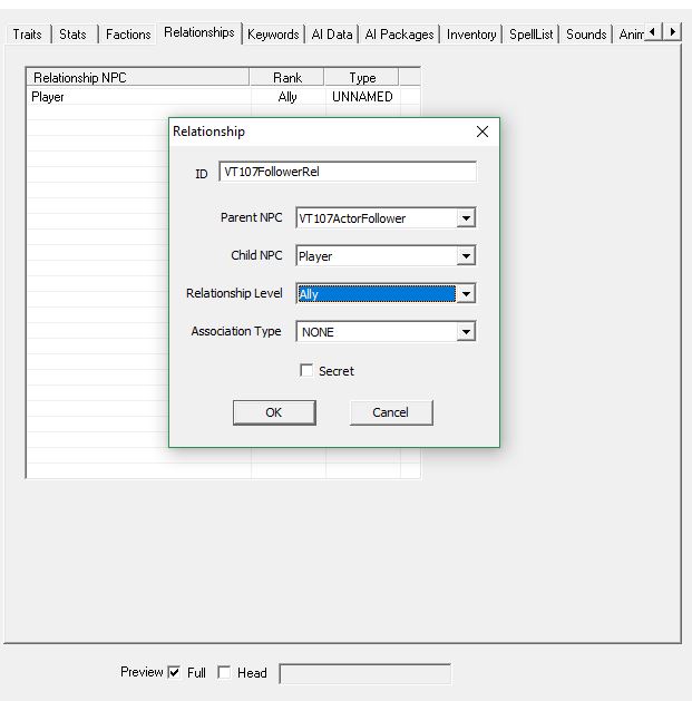 Then simply make the Child NPC “Player” and the relationship level “Ally.” It should similar to this when you’re done:
