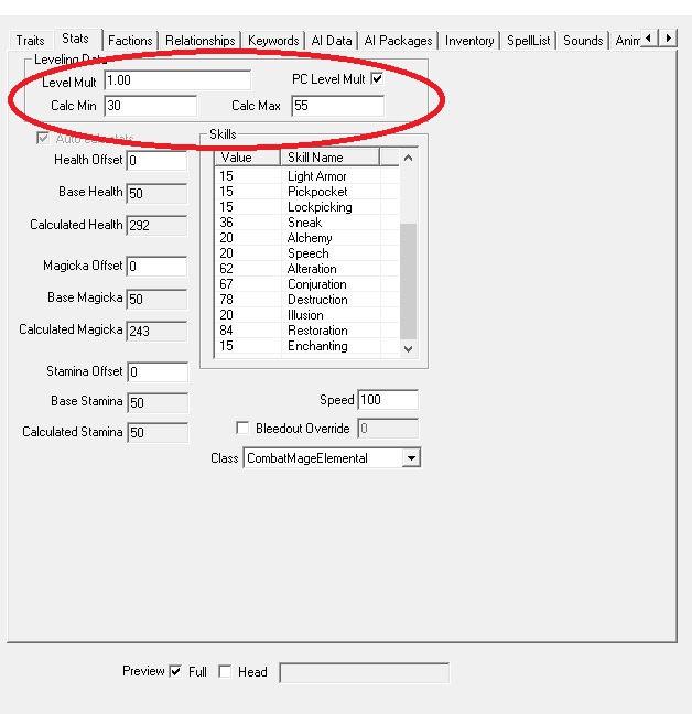 Tick the checkbox that says “PC Level Mult” and it will unlock the two portals below that say “Calc Min” and “Calc Max.” From here you can put in the follower’s min and max level, so that they will better scale with the player character and the enemies you encounter. For example, our character starts at level 30 lowest, but caps at 55: