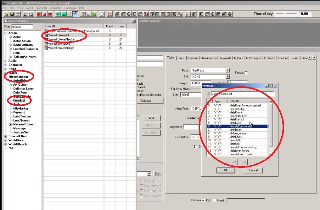 In your object window on the left, expand the Miscellaneous options and click on FormList. In the filter up top, type “follower.” Now double-click the “VoicesFollowerAll” option and scroll through to pick the one you want for your follower. If you don’t know what these voice types sound like, check out this video for samples: