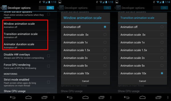 Individually select the three animation options and turn them off. This will disable animations on your device so when you open folders or launch apps, they will load immediately rather than animate. If you enjoy watching animations, you can also increase the animation scale adding a dramatic experience while you are waiting.