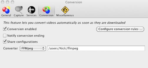 6. In the “Conversion” tab, enter the path where you dragged your ffmegX earlier. In my case “/User/Nick/ffmpegX”. When you’ve entered the correct path the letters will turn black. If the path you’ve entered is wrong, the letters will remain red and Video DownloadHelper will not work!: