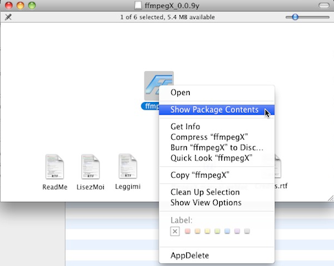 2. Double click on the DMG file. Right click on the ffmpegX icon and select “Show Package Contents”: