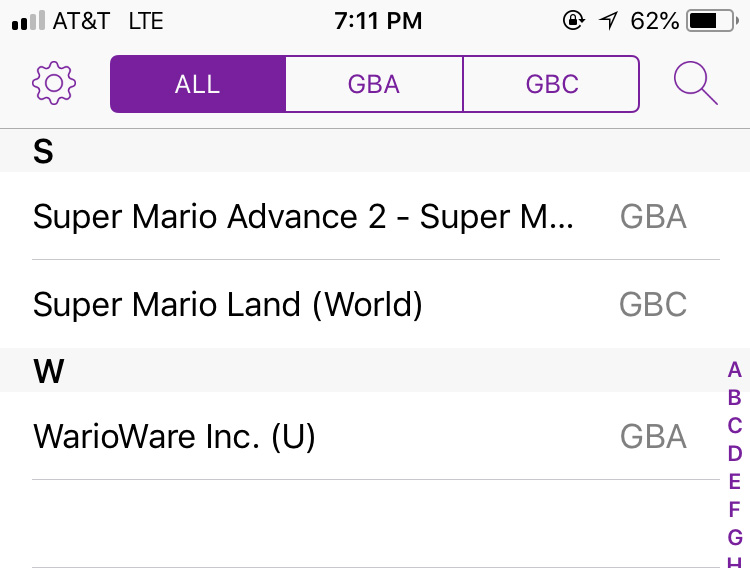 Once opened, your app should look something like this (note: We already downloaded a few games, which is why their titles appear). In order to download games, tap the magnifying glass icon in the top right. This will open a web browser within the app. Game Boy game files are called “roms”, so enter the name of the game you want into the search bar followed by rom (ex. “Super Mario Advance rom”). Numerous websites will then pop up. Choose one and download your rom. If done correctly, the title of the game will appear as shown above. Simply tap on the name of the game to play it.