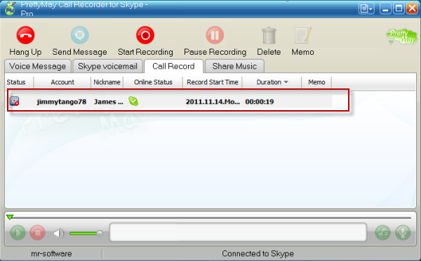 When you’ve started recording, the details of the call you’re recording are displayed in the PrettyMay interface, including the contact, the time you started recording, and the duration of the call so far. You can stop or start Skype calls from here just by clicking on the contact name.