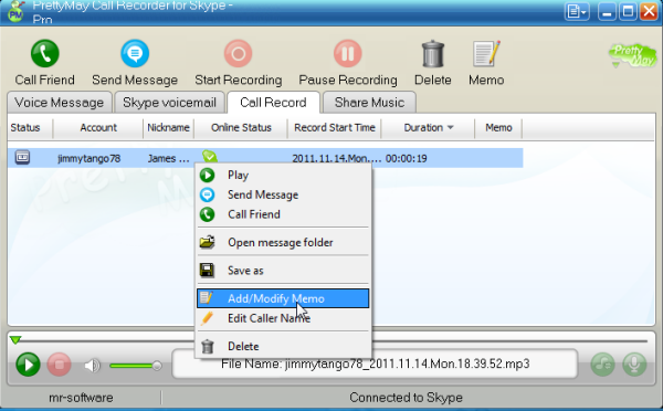 You can edit details of the call by right-clicking on the contact and selecting the ‘Add/Modify Memo’ option. This is useful because you can add information about the content of a call to help you later when you’re reviewing your recorded calls.