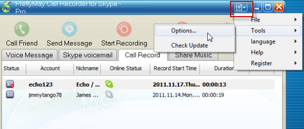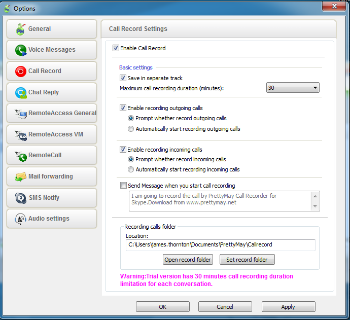 PrettyMay Call Center is a stand-alone Skype audio recorder for Windows. To use it, you need to install Skype on your PC then download PrettyMay and install it. The call recording software is available as a 30-day trial, with a 30-minute per call recording limit.