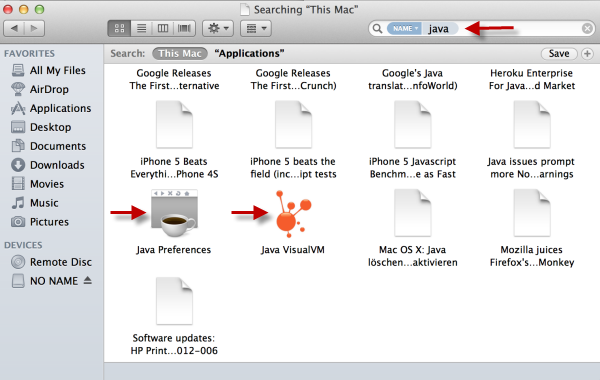 2. Note that Java won’t appear in the Applications folder as an app because it’s only installed as a preference pane. However, you can search the folder for “Java” and find it: