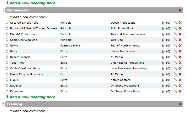 To add a new section like “Theater” or “Voiceover”, hit the “Add a new heading here” button, and type out the new header.