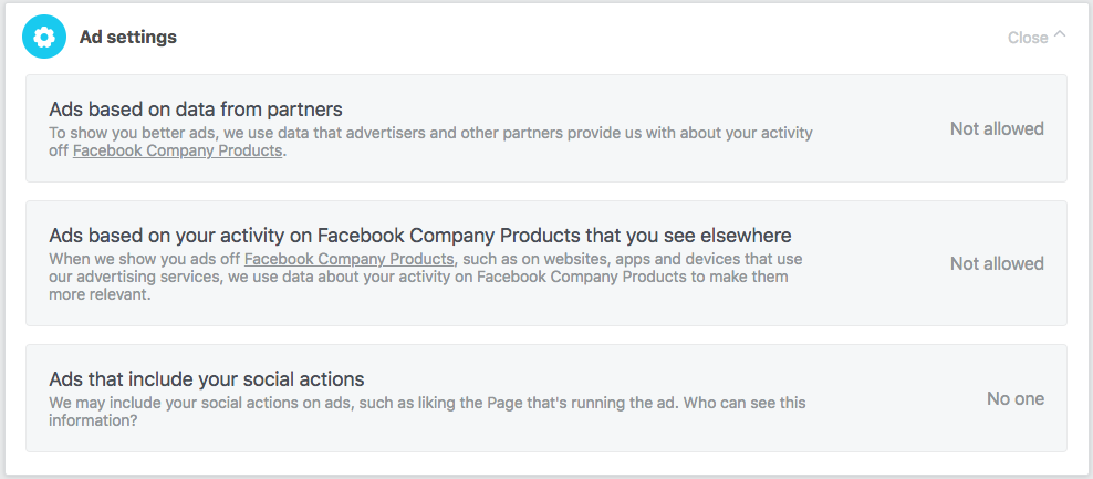 Finally, you can disallow Facebook ads from using data learned about you from other “Facebook Company Products”, such as Messenger, Instagram, and AR Studio.