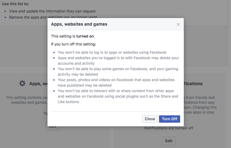 You can view and change what you share with these apps and websites individually, but if I were you, I’d remove sharing altogether. To do this, head to Apps, websites and games > edit > Turn off.