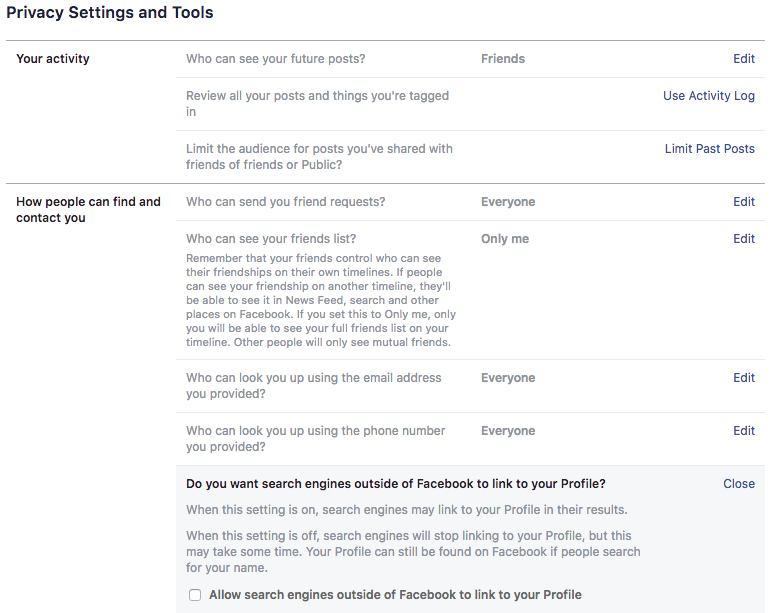 If you don’t want to be found through internet searches, you’d better turn this feature off, too. This allows search engines to link directly to your Facebook profile whenever someone searches for you by name.