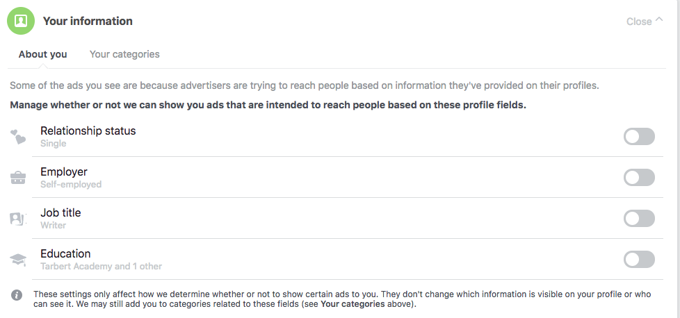 You might be surprised by how much of your information Facebook uses to show you ads. Some people like relevance, but others think it’s manipulation. Either way, you can change the settings to a level you’re comfortable with.