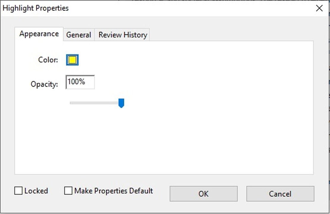 – Right-click on any single highlight, and click on Properties to call up the Highlights Properties menu. If you have multiple highlights selected, the Default box will not appear.