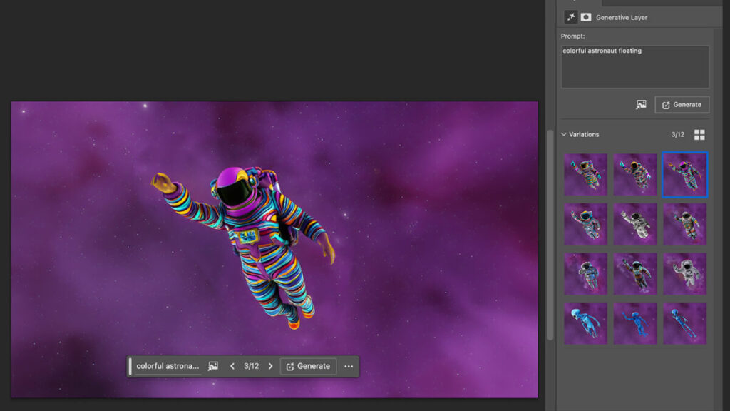 If you’re interested in a specific result and want to see similar options, Photoshop makes it easy. Just hover your mouse over the desired result and click on the three dots that appear. Then select Generate Similar, and Photoshop will show you new similar generations.