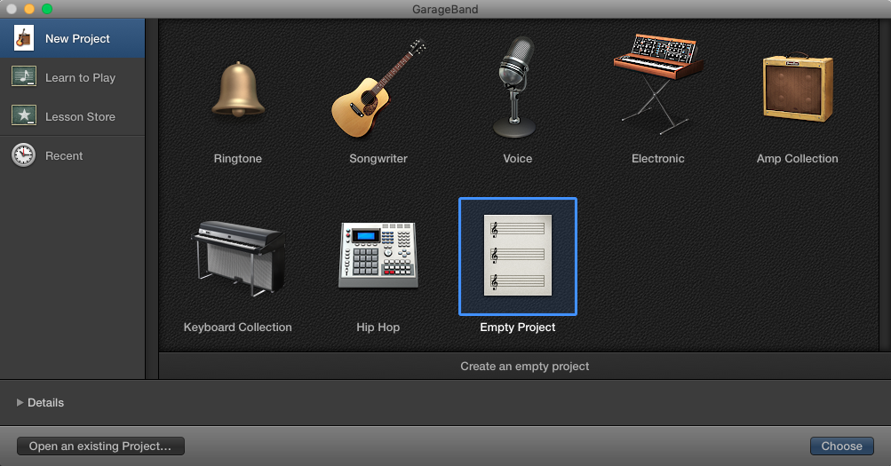 You’ll be met with a few options. For editing pre-existing tunes, we recommend “Empty Project.” The others often include audio presets, meant to improve the recording of works in progress. For example, the “Voice” setting applies a “Bright Vocals” effect to whatever audio lands in its main track. The unaware user may become frustrated when their recording doesn’t sound natural at all!