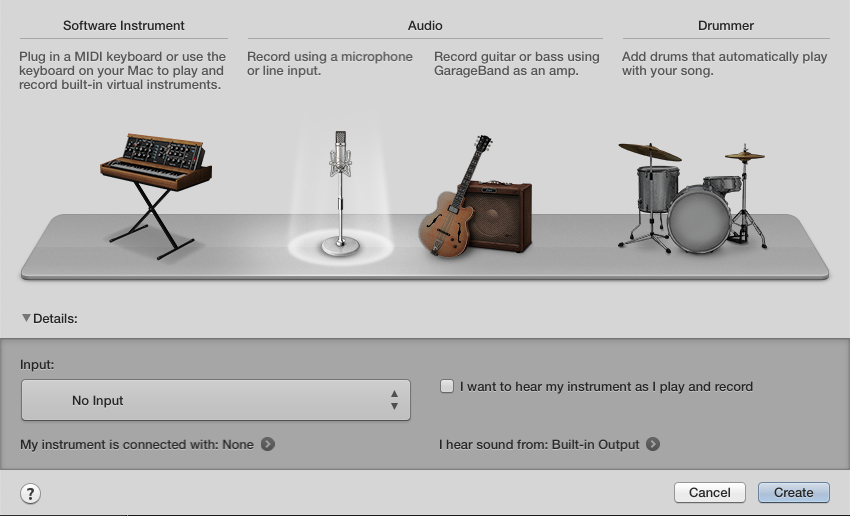 From here, you’ll meet another options screen: instrument choice. Since you’re coming with audio already recorded, use the basic “Microphone” setting. Then click “Create.” We’re on to the studio!