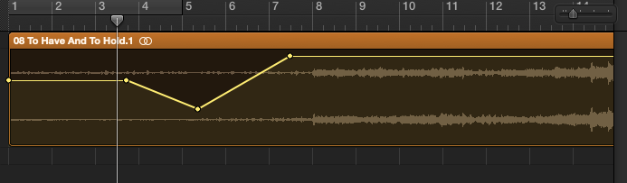 Click the yellow line to insert a “handle”. Once you have two or more, you can begin to raise or lower the volume in specific areas.