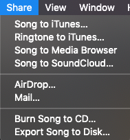 We recommend “Export Song to Disk,” which creates an MP3 file on your desktop or within a folder on your computer. From there, you can perform all the other actions: place it in an email, burn it to a CD, or drop it into iTunes!